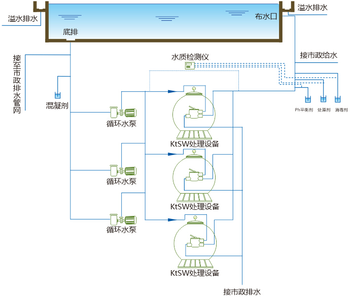 游泳池池水的循環(huán)過濾消毒就是其水處理工藝流程,游泳池池水處理的特點(diǎn)是循環(huán)過濾,其設(shè)計(jì)要點(diǎn)是循環(huán)水流量和循環(huán)周期問題,還有給水口、回水口的分布以使均勻布水問題,死水區(qū)和短流的問題。