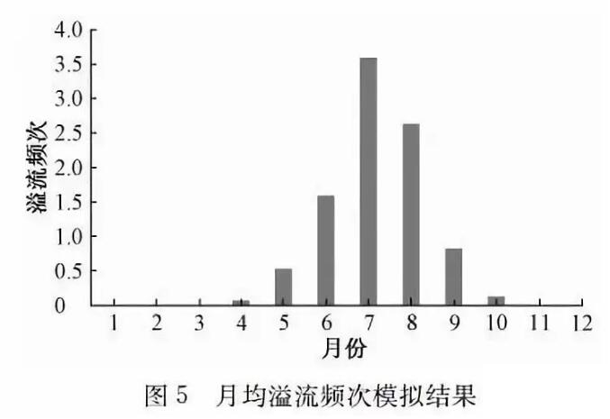 CSO事件劃分后的統計結果如圖4、圖5所示。年均溢流頻次為9.4次,其中最大年份為2008年,溢流16次;最小年份為1999年,溢流1次。年均溢流體積為1.45萬m3,最大溢流體積為3.64萬m3,出現于2016年,6~8月份溢流頻次占年均溢流頻次的比例為83%。