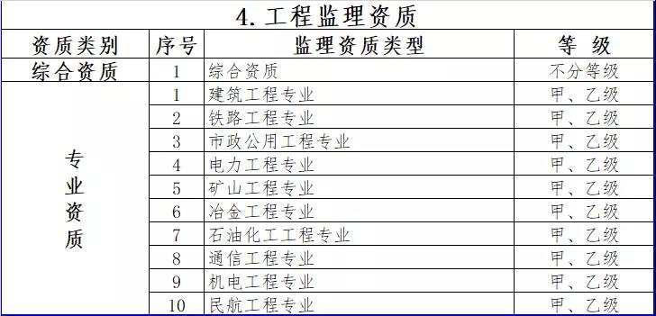 4.工程監理資質。保留綜合資質;取消專業資質中的水利水電工程、公路工程、港口與航道工程、農林工程資質,保留其余10類專業資質;取消事務所資質。綜合資質不分等級,專業資質等級壓減為甲、乙兩級。