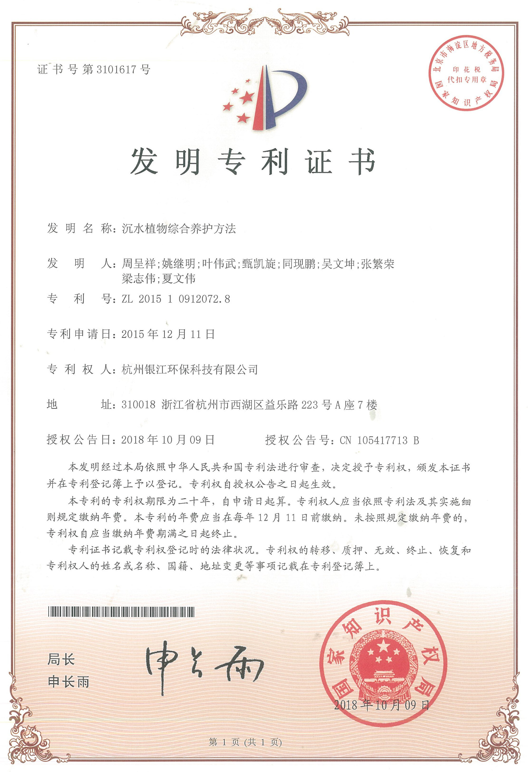 近日,杭州銀江環(huán)保科技有限公司再次獲一項(xiàng)發(fā)明專利:沉水植物綜合養(yǎng)護(hù)方法(專利號(hào)ZL 201510912072.8)。