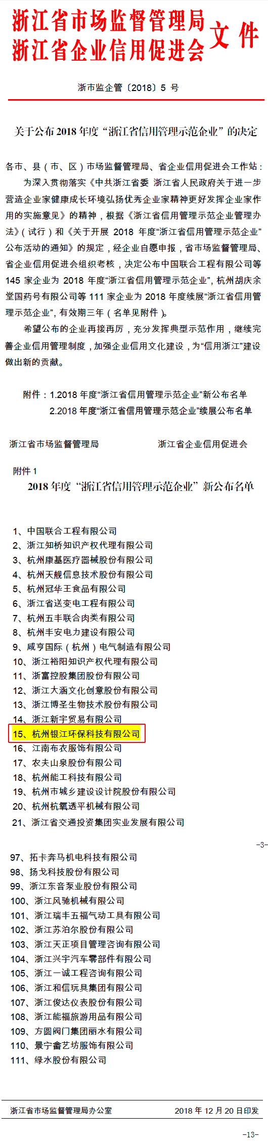 銀江環保榮獲2018年度“浙江省信用管理示范企業”發布日期:2018-12-21