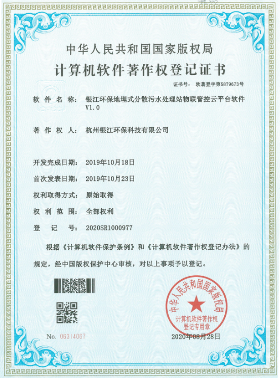 杭州銀江環(huán)保科技有限公司再獲兩項軟著:銀江環(huán)保地埋式分散污水處理站物聯(lián)管控云平臺軟件V1.0、銀江環(huán)保醫(yī)院污水處理系統(tǒng)物聯(lián)管控云平臺軟件V1.0,該軟著的取得為銀江治水又添一利器。