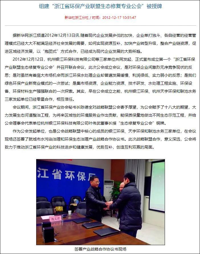 浙江省環(huán)保產(chǎn)業(yè)聯(lián)盟生態(tài)修復(fù)公會于2012年12月12日由銀江環(huán)保、天宇環(huán)保和聯(lián)池水務(wù)三家單位共同發(fā)起成立。