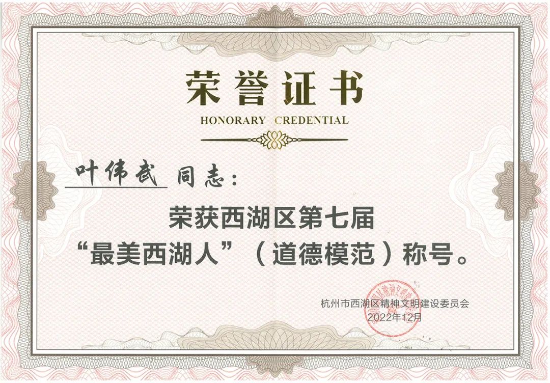 董事長葉偉武榮獲西湖區(qū)第七屆“最美西湖人”(道德模范)稱號發(fā)布日期:2023-01-13