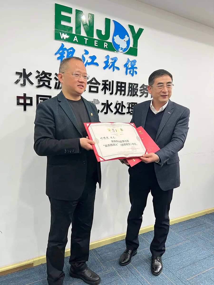1月13日上午,西湖區(qū)領(lǐng)導走訪銀江環(huán)保,區(qū)委副書記陸志敏為董事長葉偉武頒發(fā)西湖區(qū)第七屆“最美西湖人”(道德模范)稱號榮譽證書。